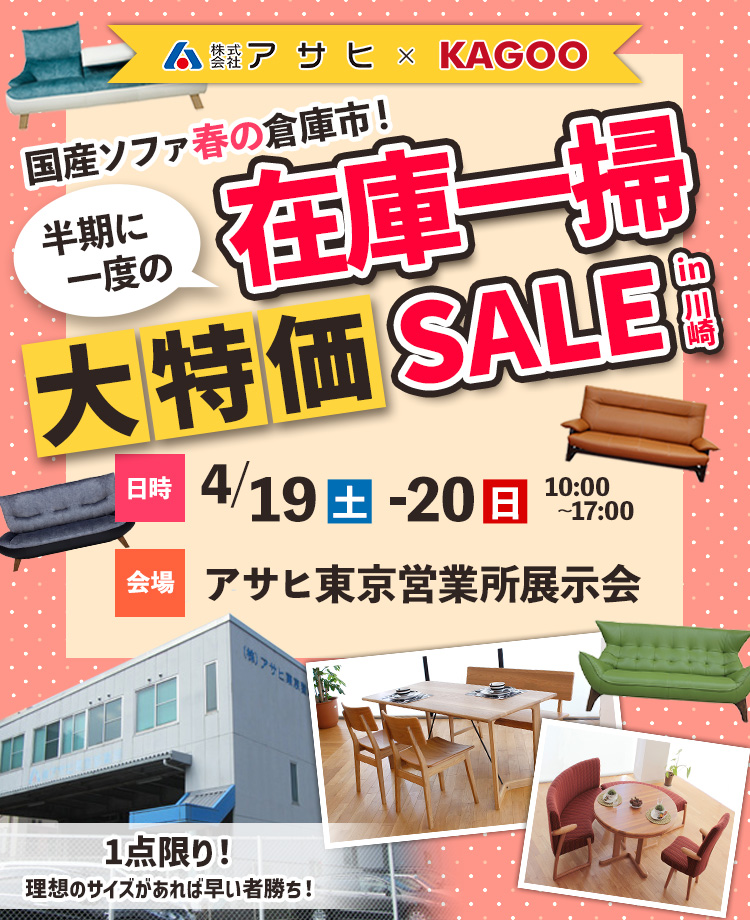 ずっとソファーが欲しくて○○家具さんや○○家具さんを見て回っていたんですけど、どうしても値段が高くて手が出ない高級商品ばかりでした。でも、KAGOOさんからでアウトレットの展示会があるという話を聞いてダメもとで参加してみることに。会場はお世辞にも快適とは言えませんでしたが、展示されている商品の値段は納得のいくものでした。お陰様で今はこうしてメールを書いている時もこのソファーを使っています。今度、9月に引っ越しする予定なのでまたお宝商品を探しに参加させていただくつもりです。ありがとうございました。
